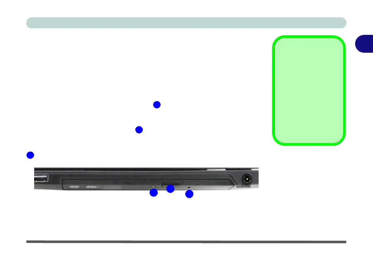 To insert a CD/DVD, press the open button 1 and carefully place a CD/DVD onto