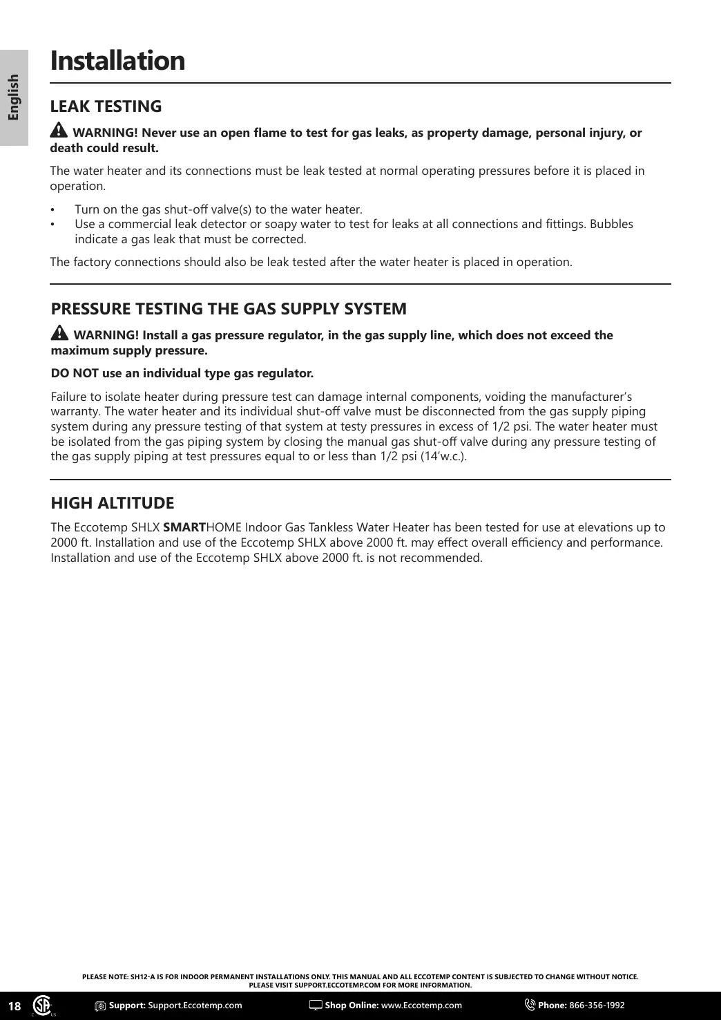 2000 ft. Installation and use of the Eccotemp SHLX above 2000 ft. may eect overall eciency and performance.