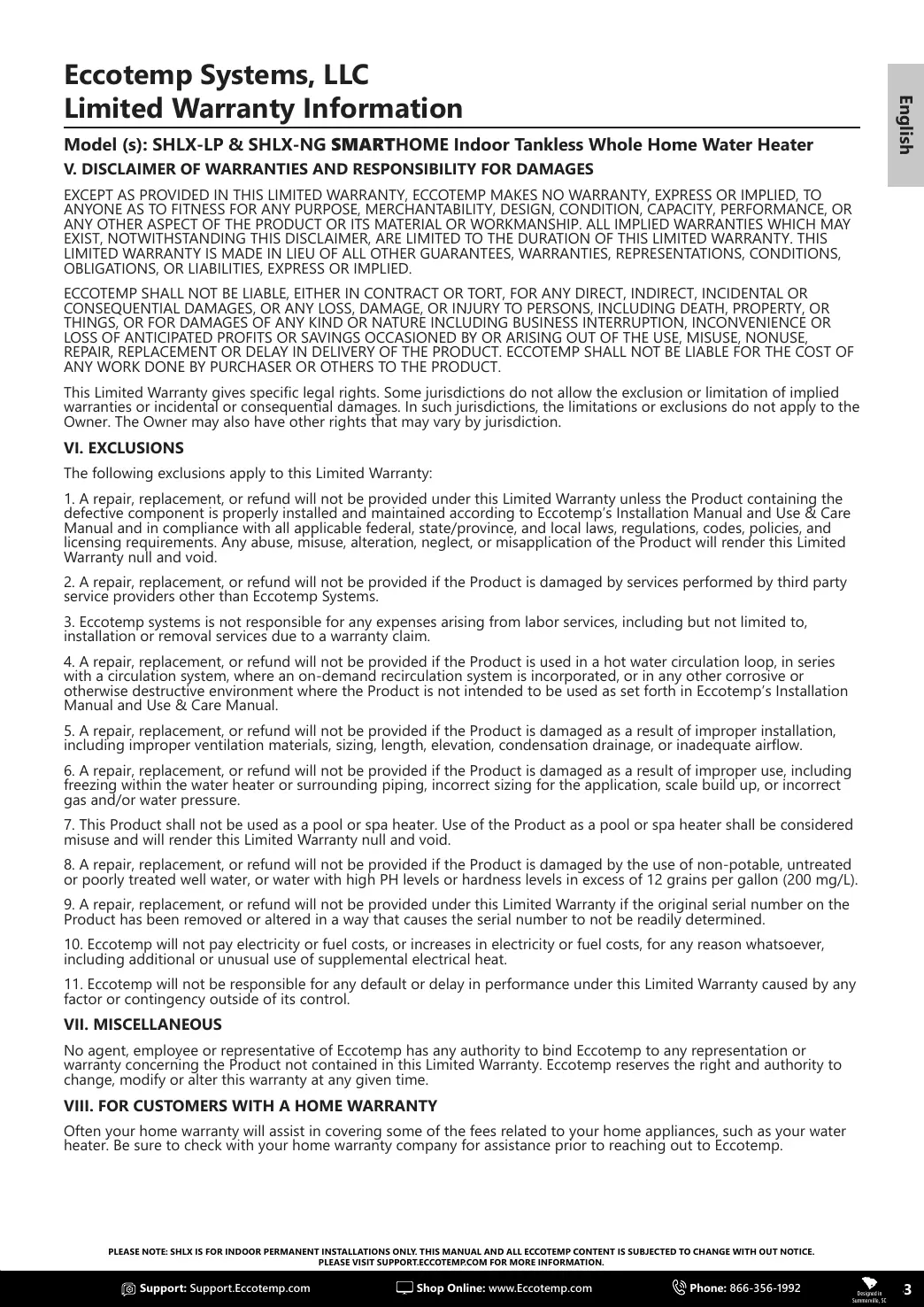 PLEASE NOTE: SHLX IS FOR INDOOR PERMANENT INSTALLATIONS ONLY. THIS MANUAL AND ALL ECCOTEMP CONTENT IS SUBJECTED TO CHANGE WITH OUT NOTICE.