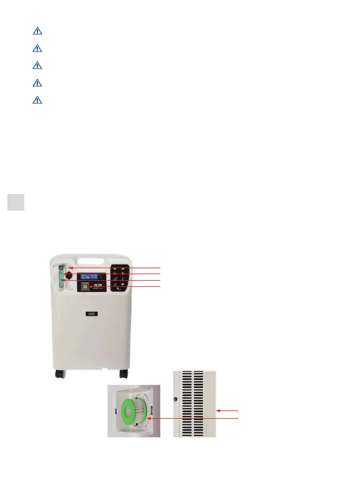 riziku požáru a zranění osob, nepoužívejte na kyslíkový koncentrátor ani v jeho okolí oleje a maziva.