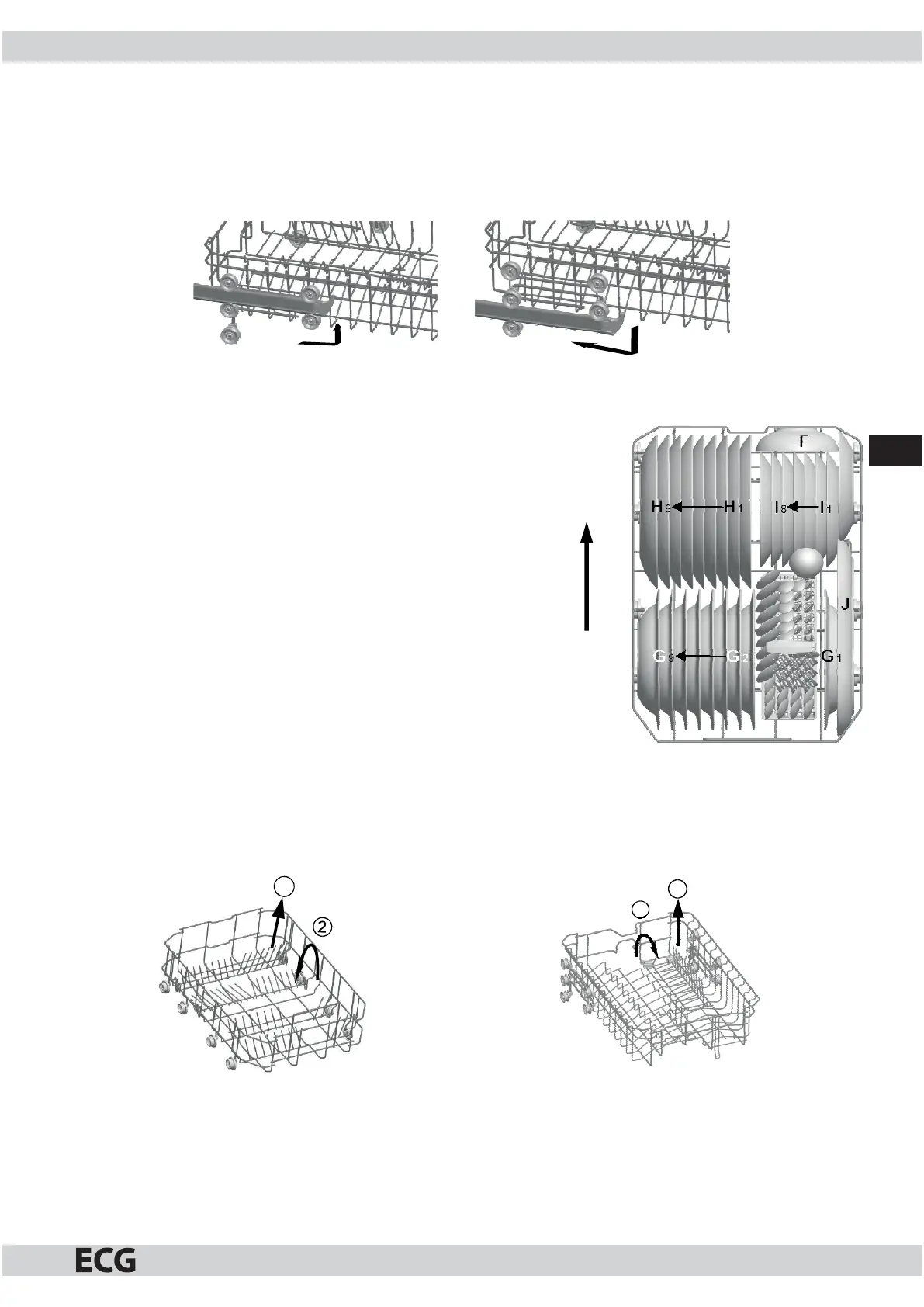 vāki, šķīvji un bļodas, ir jāievieto zemākajā grozā, kā parādīts attēlā.