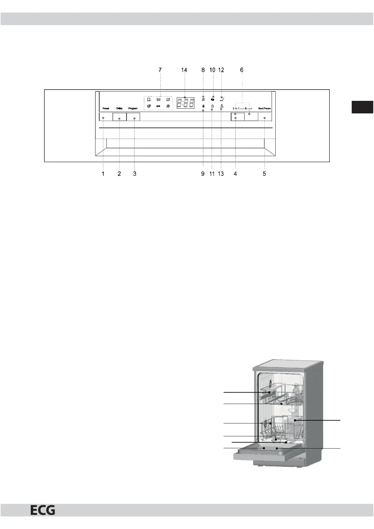13. Drying indicator: Iight is on when the dishwasher dries the dishes.