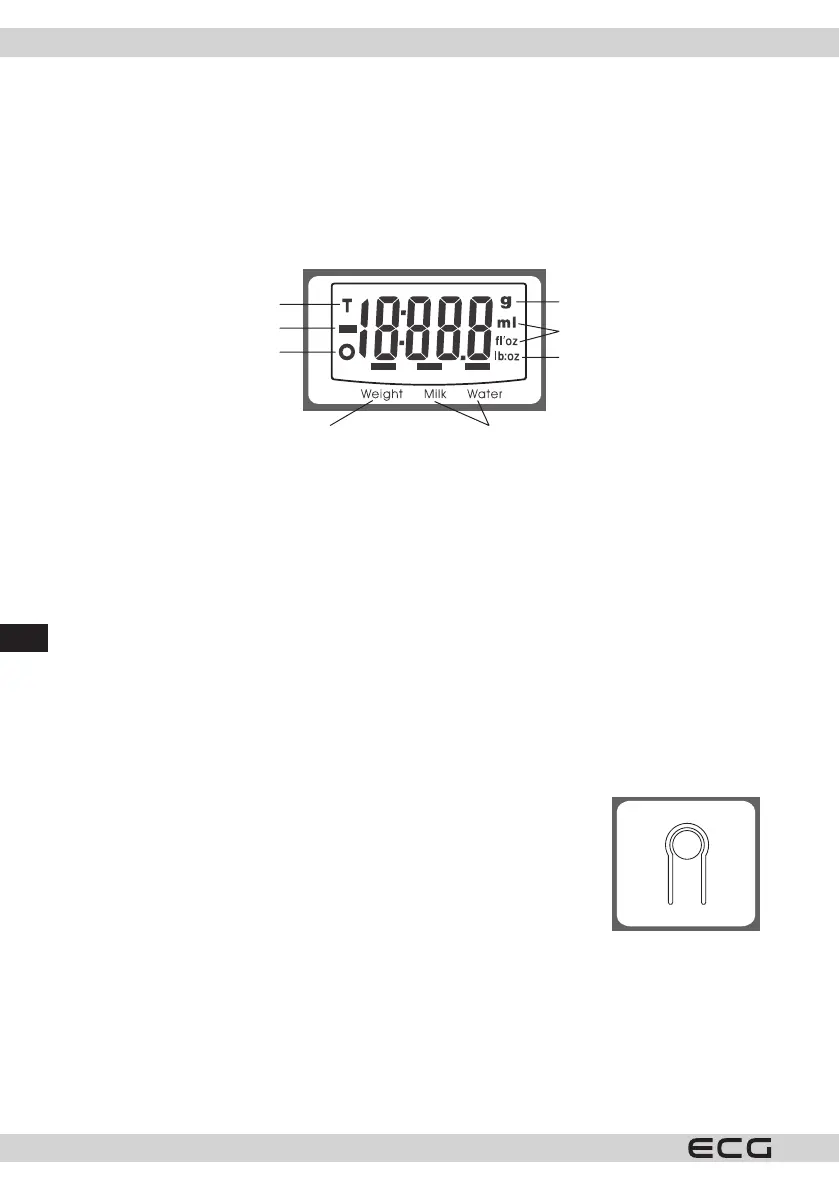 5. Placez sur la balance (dans le bol) l’objet àpeser et l’écran LCD achera le poids mesuré de l’objet.