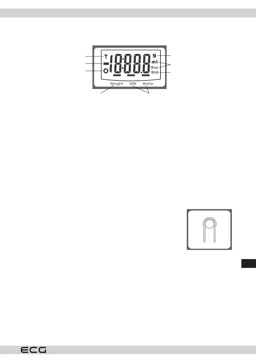 Kiekvieną kartą nuspaudus ZERO/ON/OFF mygtuką, LCD ekrane rodoma „ ----- “ arba „0g“. „ ----- “ reiškia, kad
