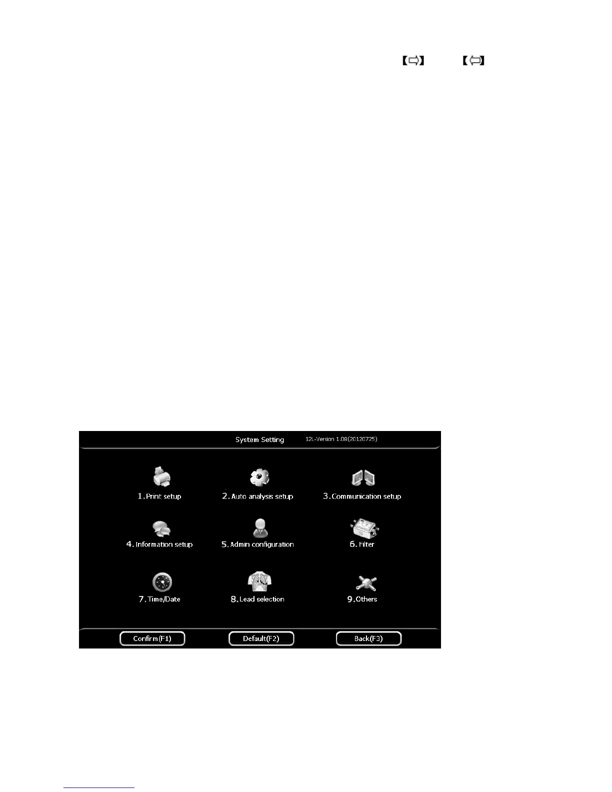 return, or press 【F2】 button to return to the default setup. Press button 【1】~【9】to enter different