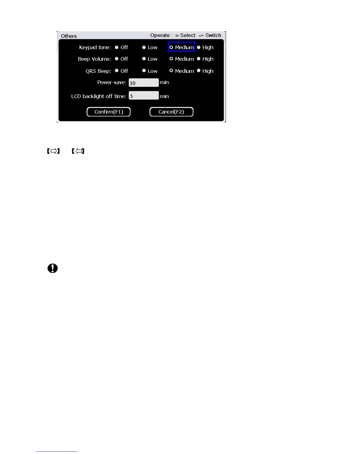 “keypad tone”, “Beep volume”, “QRS Beep”, “Power-save” and “LCD backlight off time”, and use