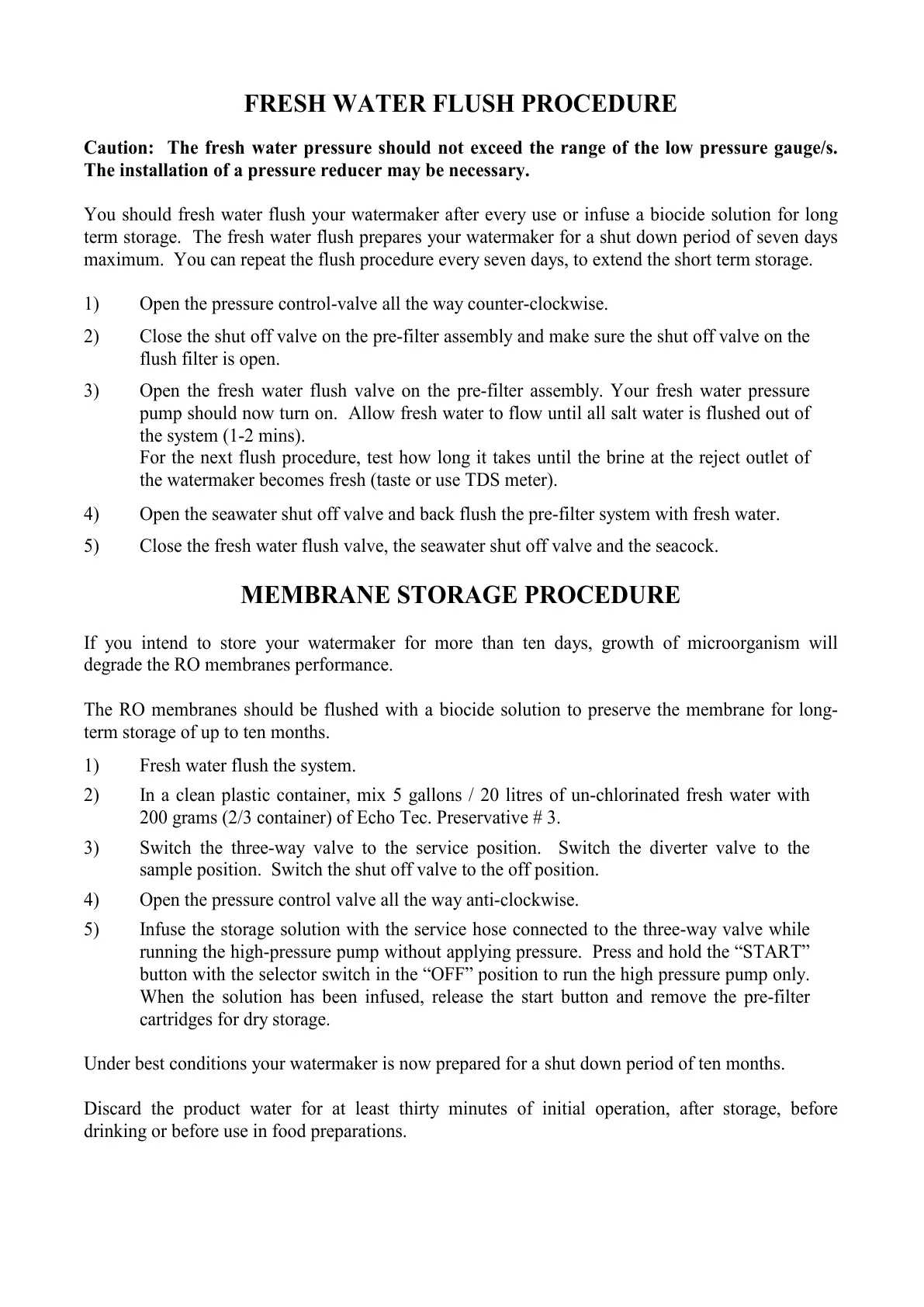 term storage. The fresh water flush prepares your watermaker for a shut down period of seven days
