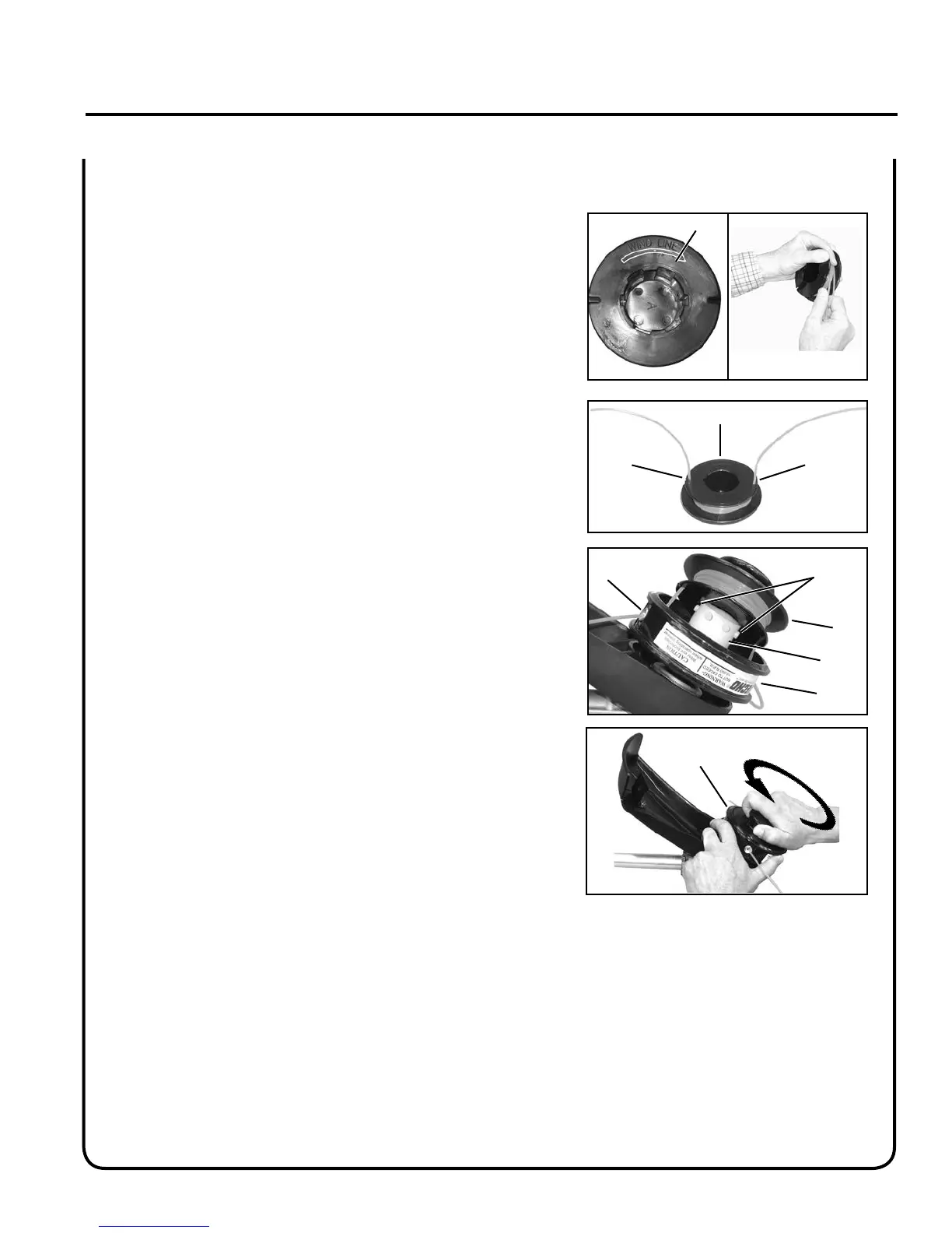 4. Place ends of line (C) into notches (F) in spool, leaving 6 in. pro-