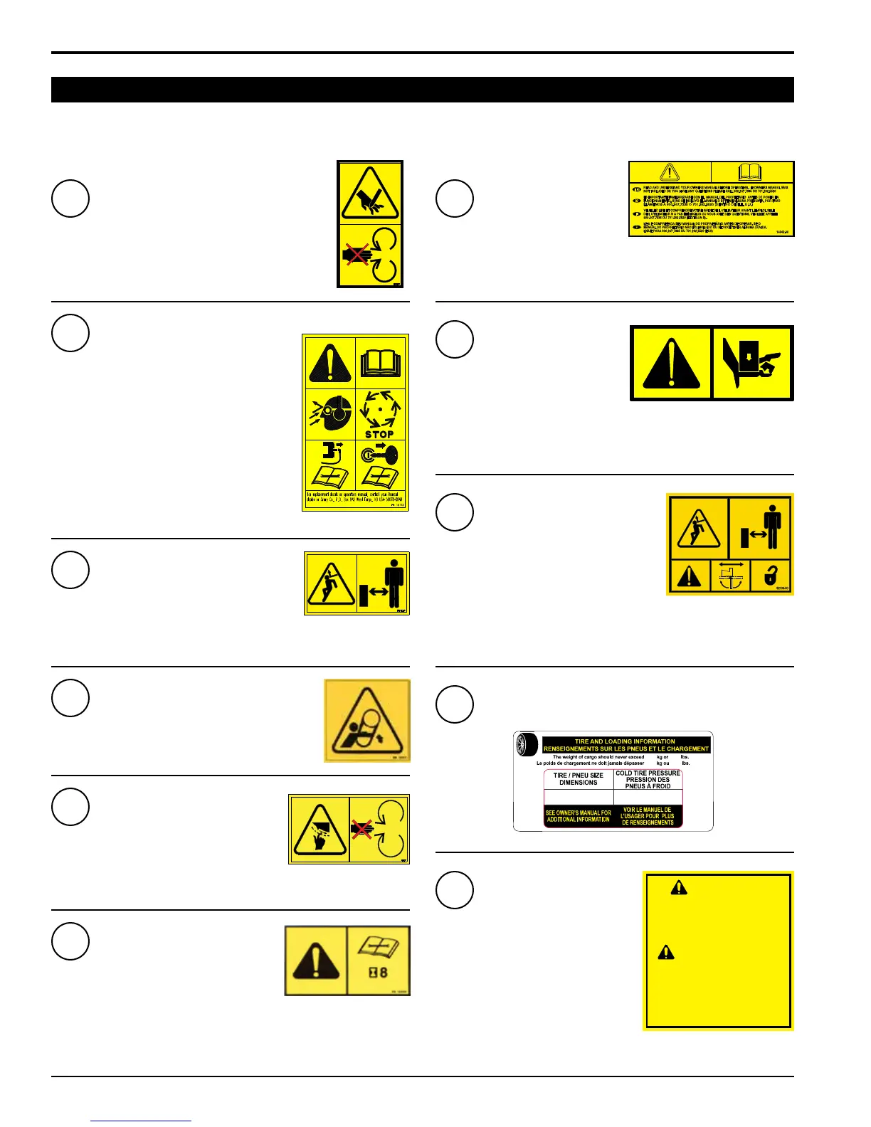 See Section 1.10 for decal locations. Familiarize yourself with all of the safety and operating decals on the machine