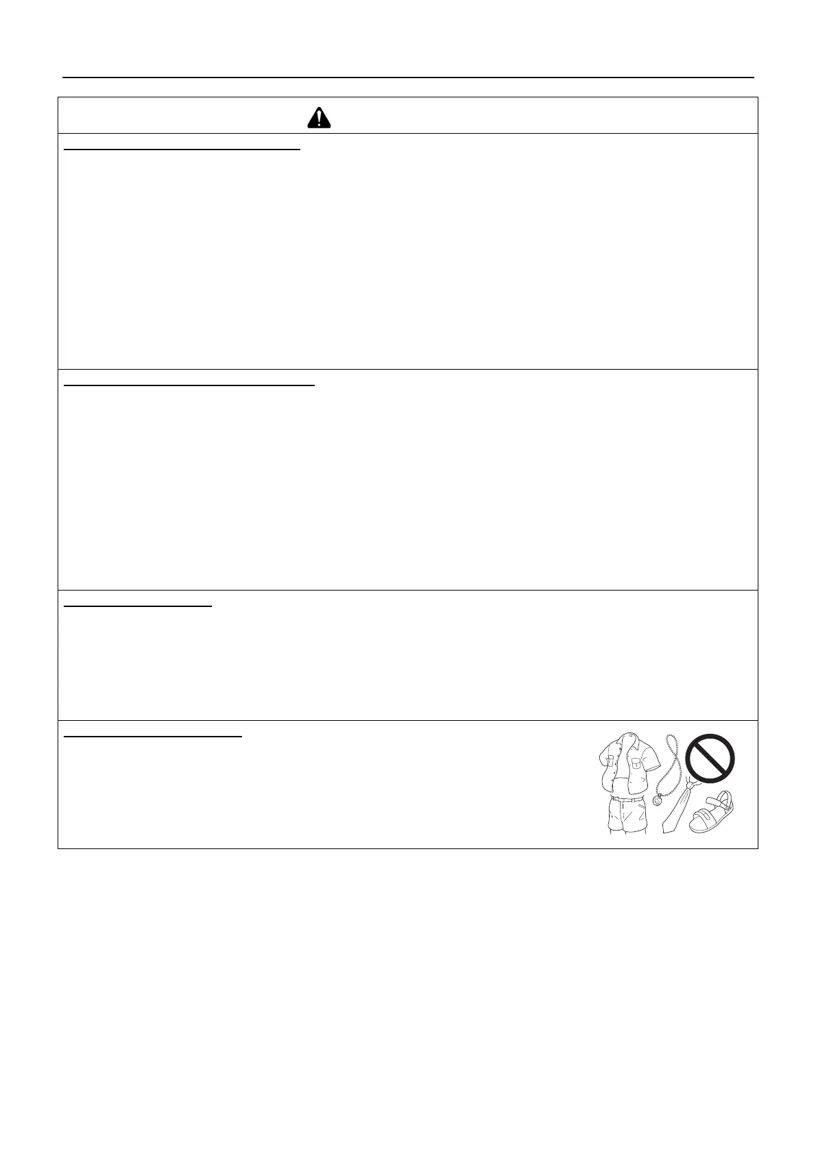 Ne pas porter de chaussures ouvertes, ne pas travailler pieds nus ou jambes nues.