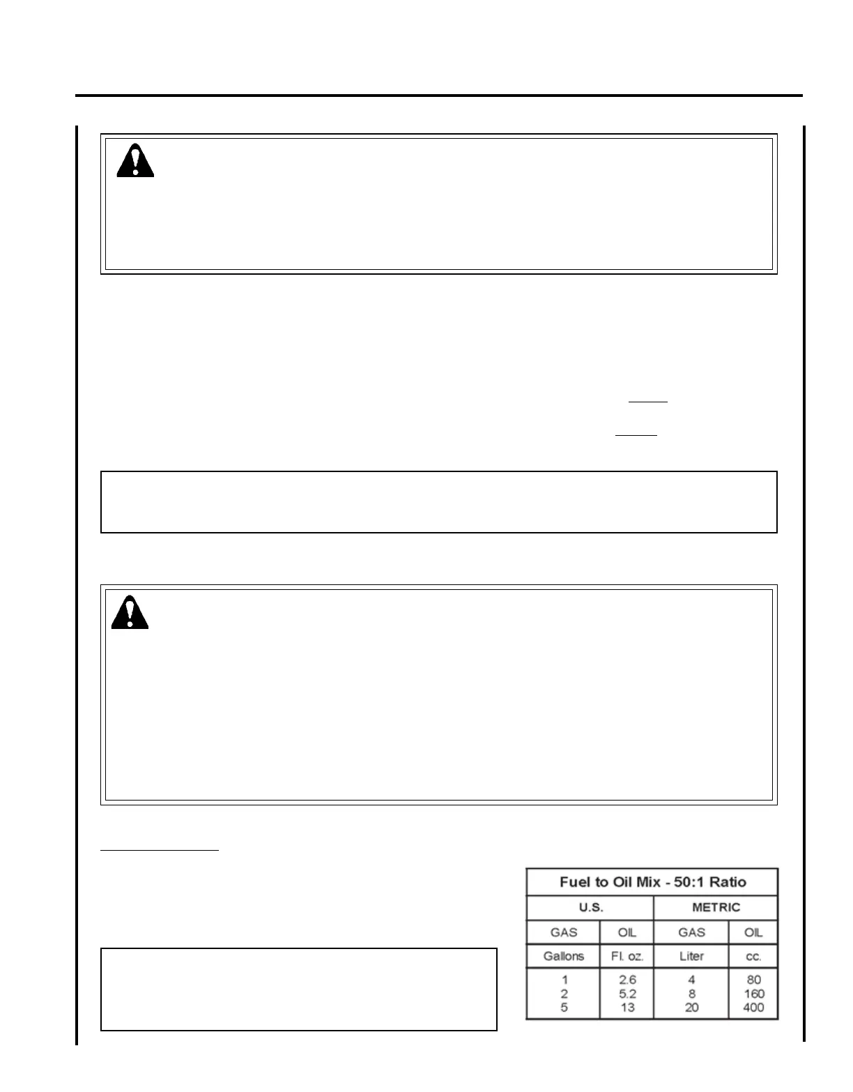 Fuel is VERY ammable. Use extreme care when mixing, storing or handling or serious personal injury may result.