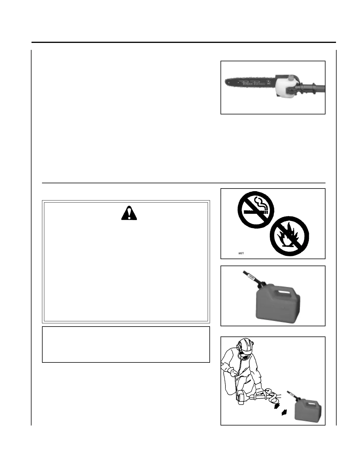 • Fuel tanks/cans may be under pressure. Always loosen fuel caps