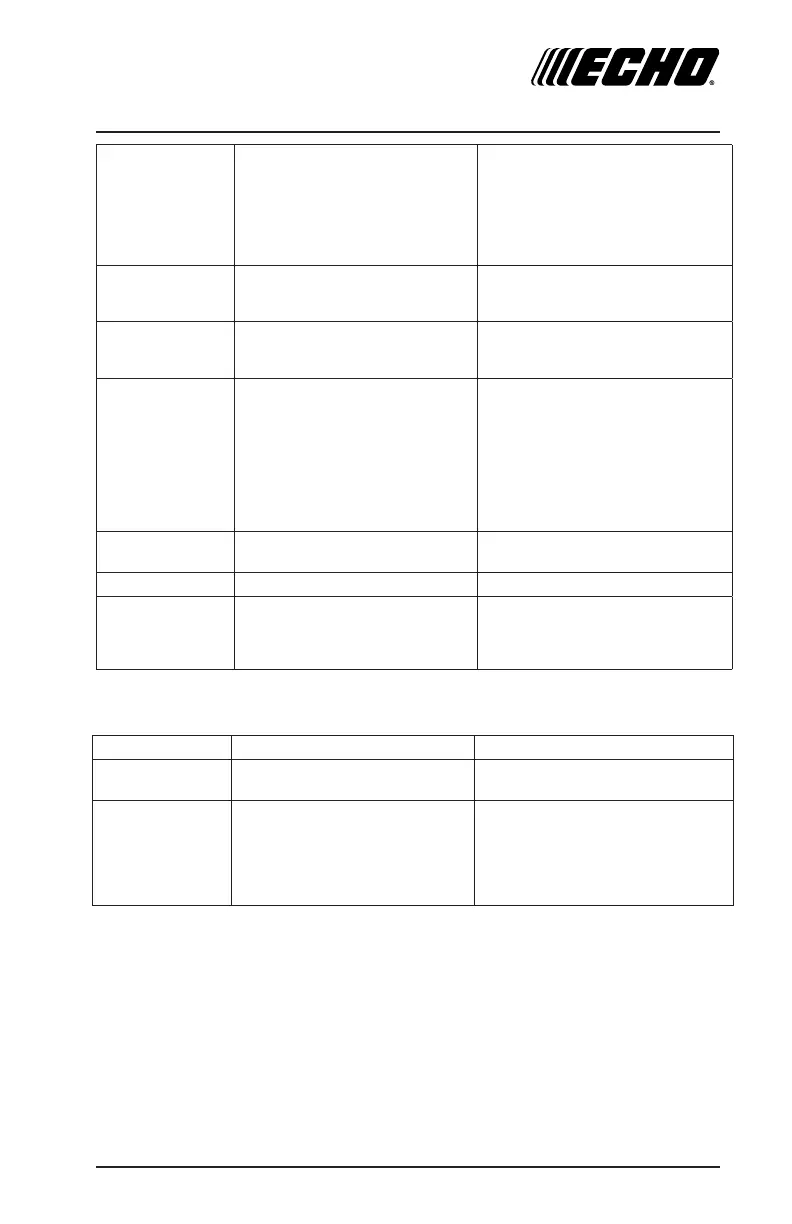 Engine lacks power 1. Dirty air lter 1. Replace air lter