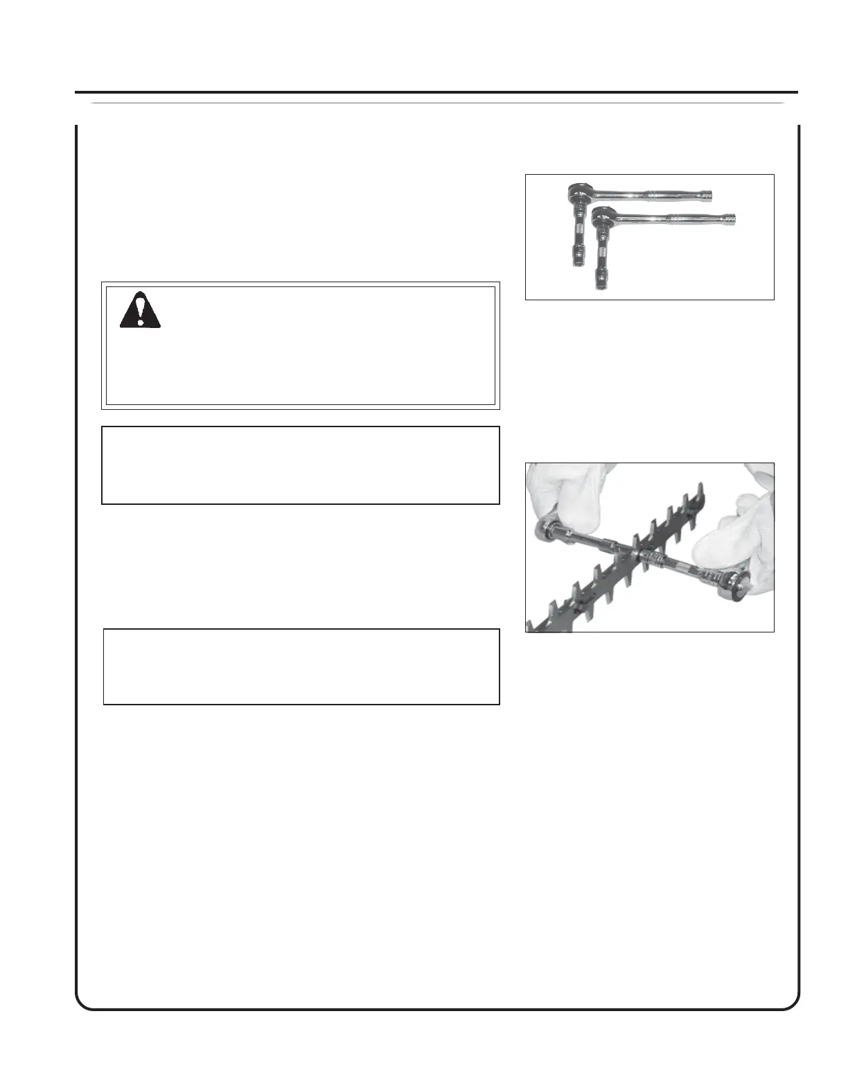 1. Tighten blade bolts until snug, then loosen blade bolts 1/2 turn.
