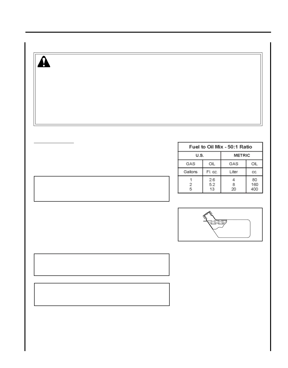 Fuel is VERY ammable. Use extreme care when mixing, storing or handling or serious personal injury may result.