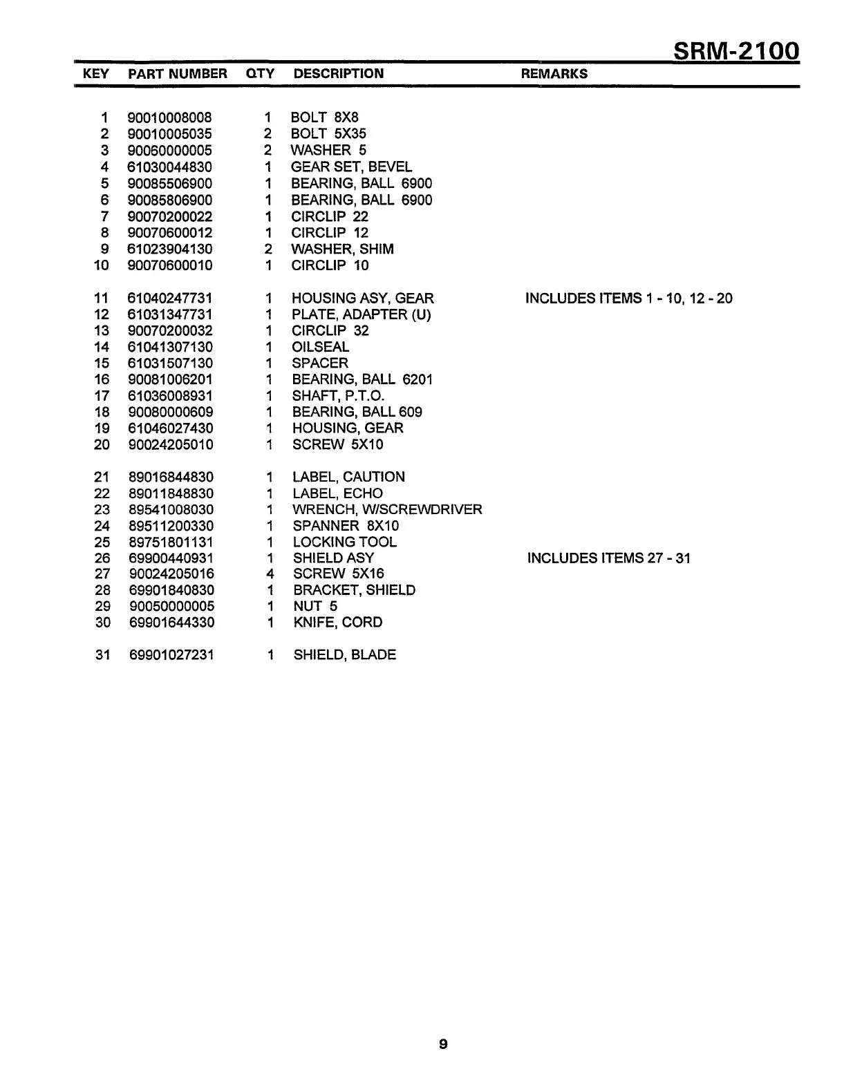 Echo SRM-2100 - PARTS CATALOG SERIAL NUMBER 001001 THRU 159490