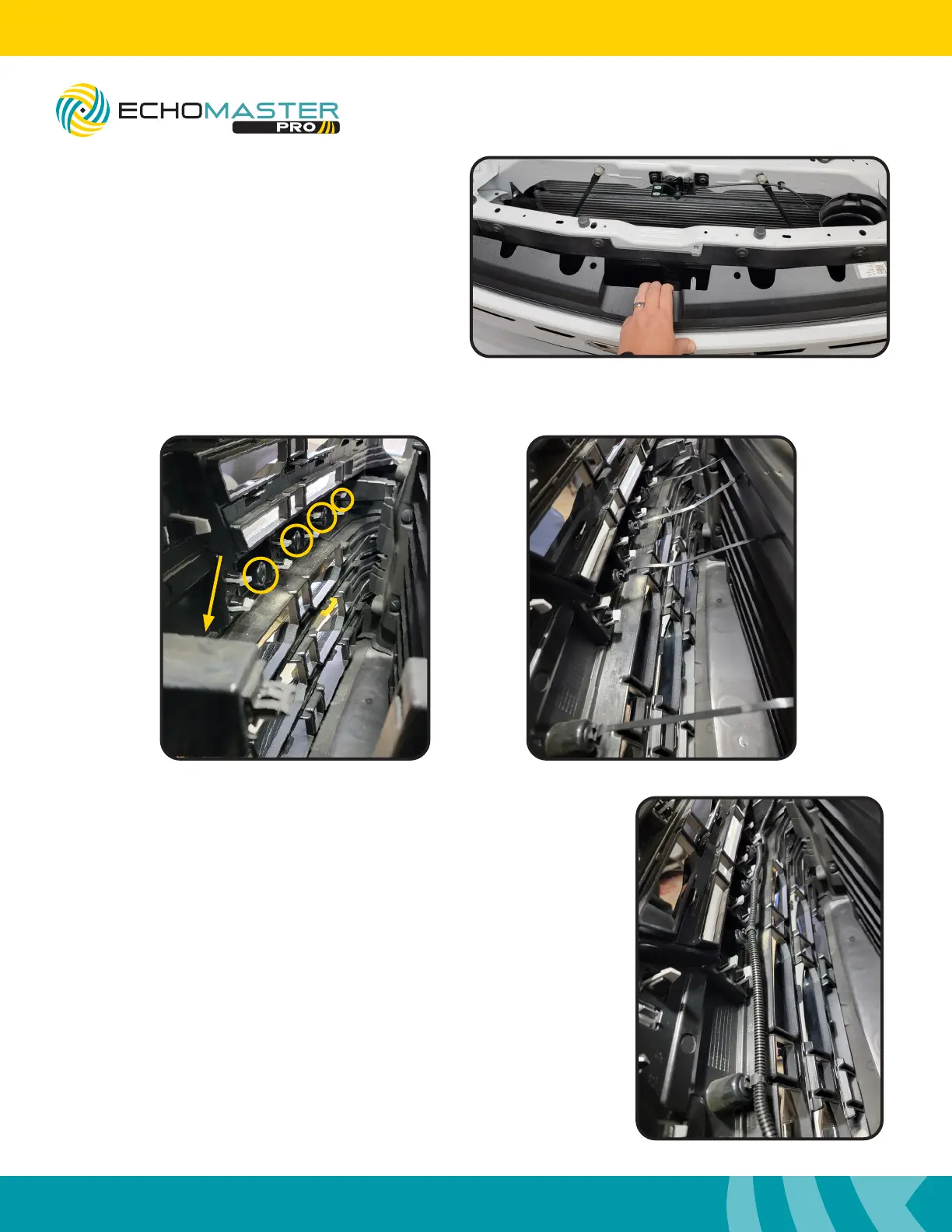 Locate 5 open mounting holes in the back of the front fascia and insert the provided zip ties with attached