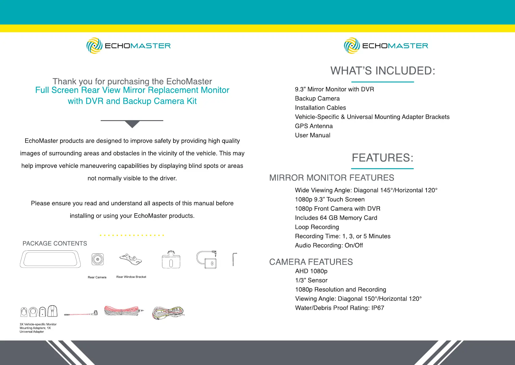 Echomaster MRC-HDDVR - Product Overview and Features; Whats Included; Mirror Monitor Features; Camera Features