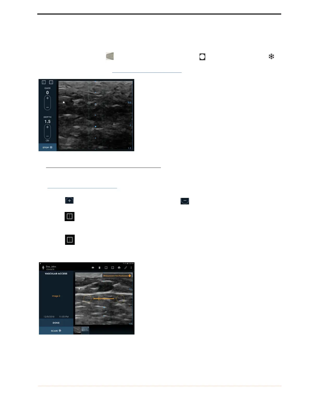 icon to start (unfreeze) and stop (freeze) ultrasound scans. The image automatically generated is a linear scan that