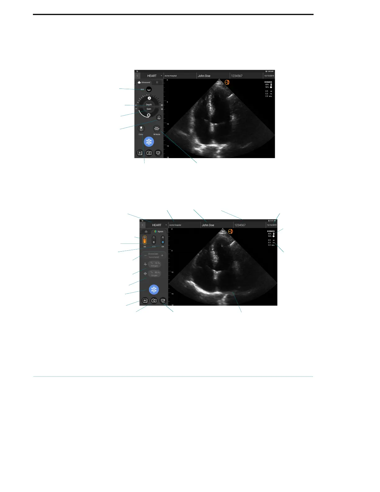 EchoNous KOSMOS - Imaging Screen: Ultrasound Tab (B-Mode); Imaging Screen: Three-Signal Tab