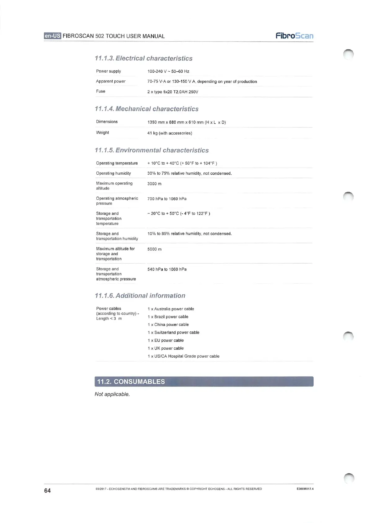 echosens FibroScan 502 touch - Electrical Characteristics; Mechanical Characteristics; Environmental Characteristics; Additional Information