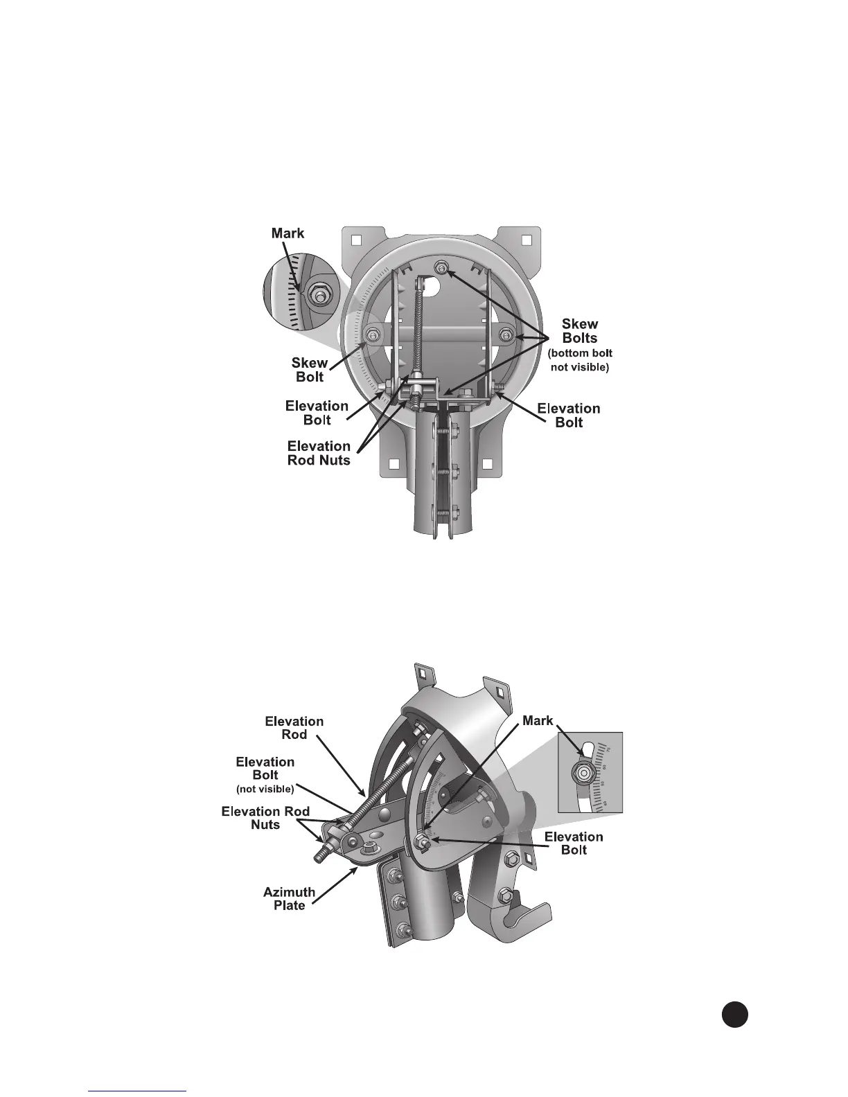the skew bolts. Set the skew by rotating the elevation and skew bracket to align the mark with the