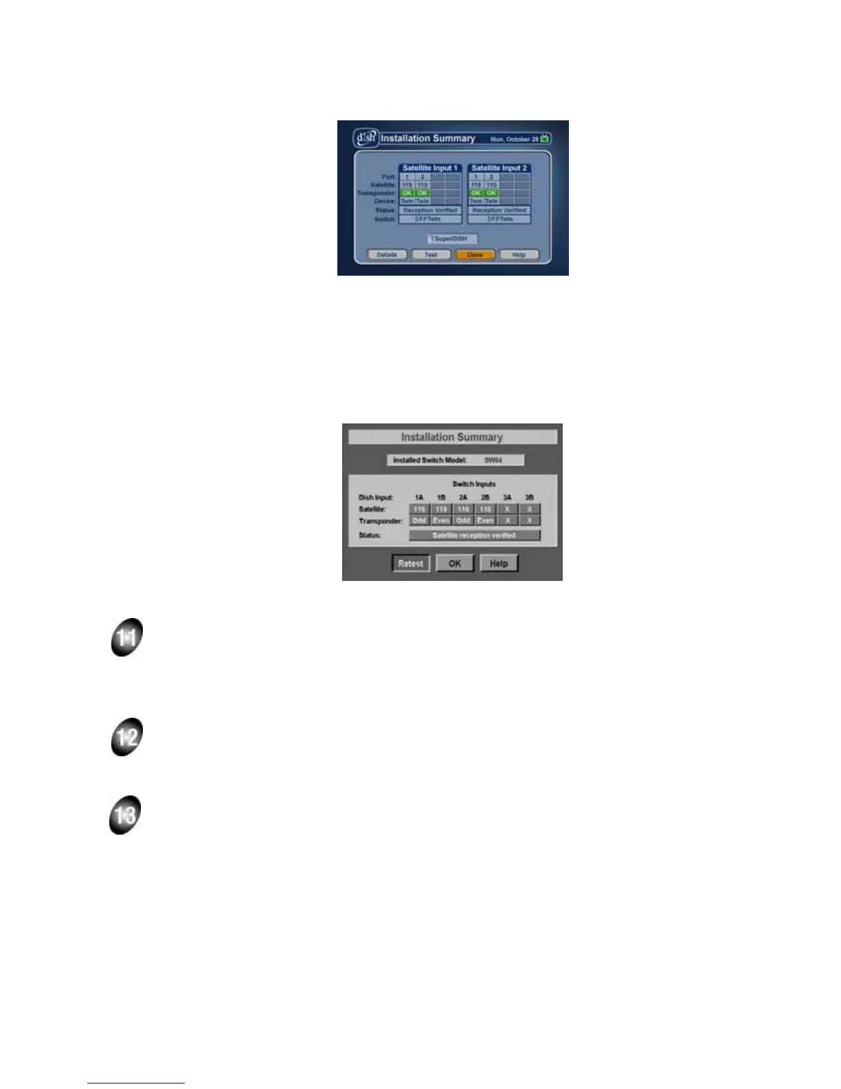 Select OK or Done to exit the Installation Summary screen. The Point Dish/Signal screen