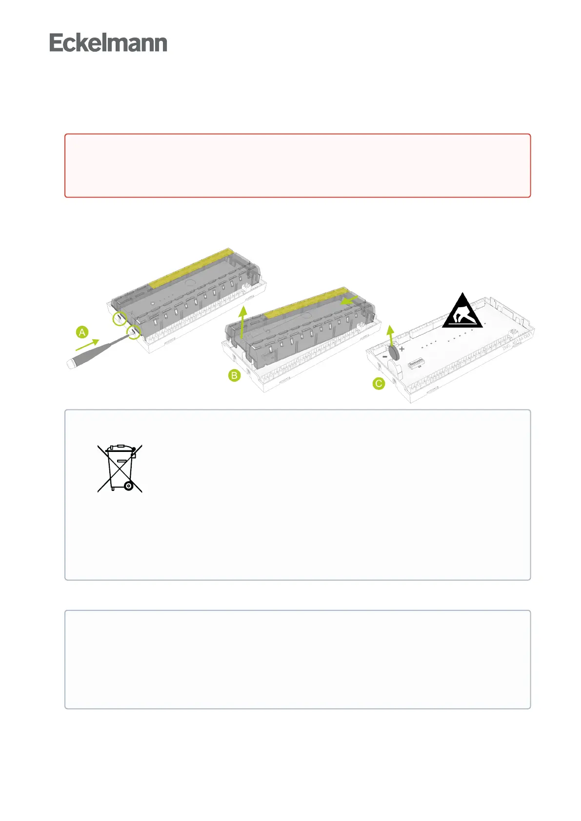 (C) Pull the battery (C) upwards out of the battery holder and dispose of it correctly.