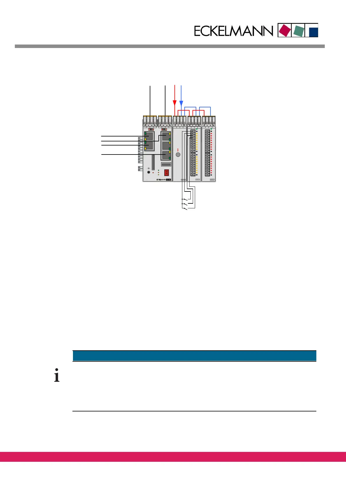 • The 24V voltage is connected with the modules LBM PWR04, LBM DOM16 and LBM