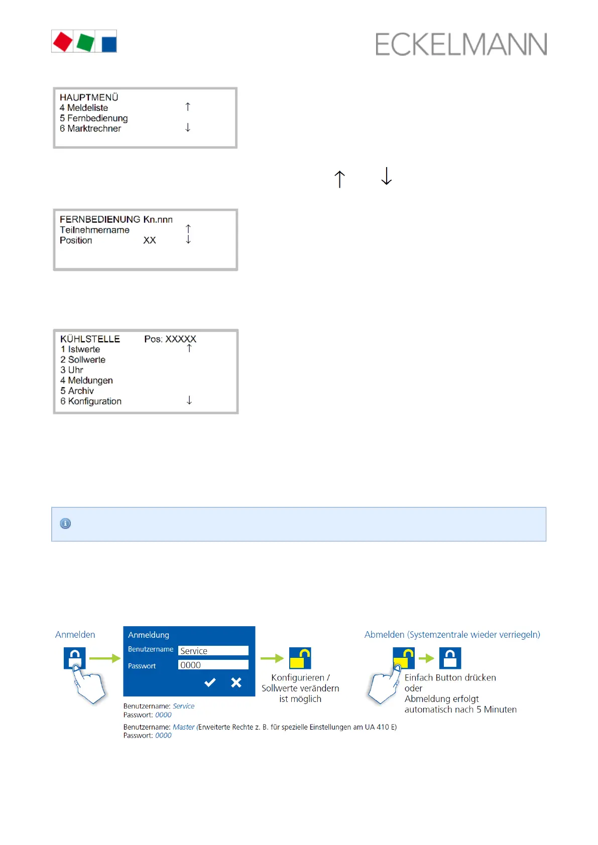 Login to and logout (unlock and lock-down) of the system centre: