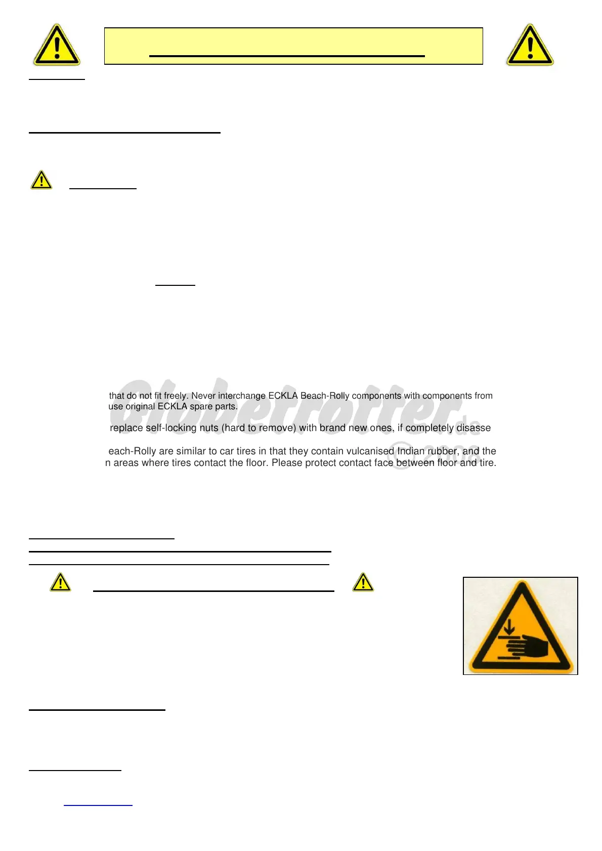Do not force parts that do not fit freely. Never interchange ECKLA Beach-Rolly components with components from a different