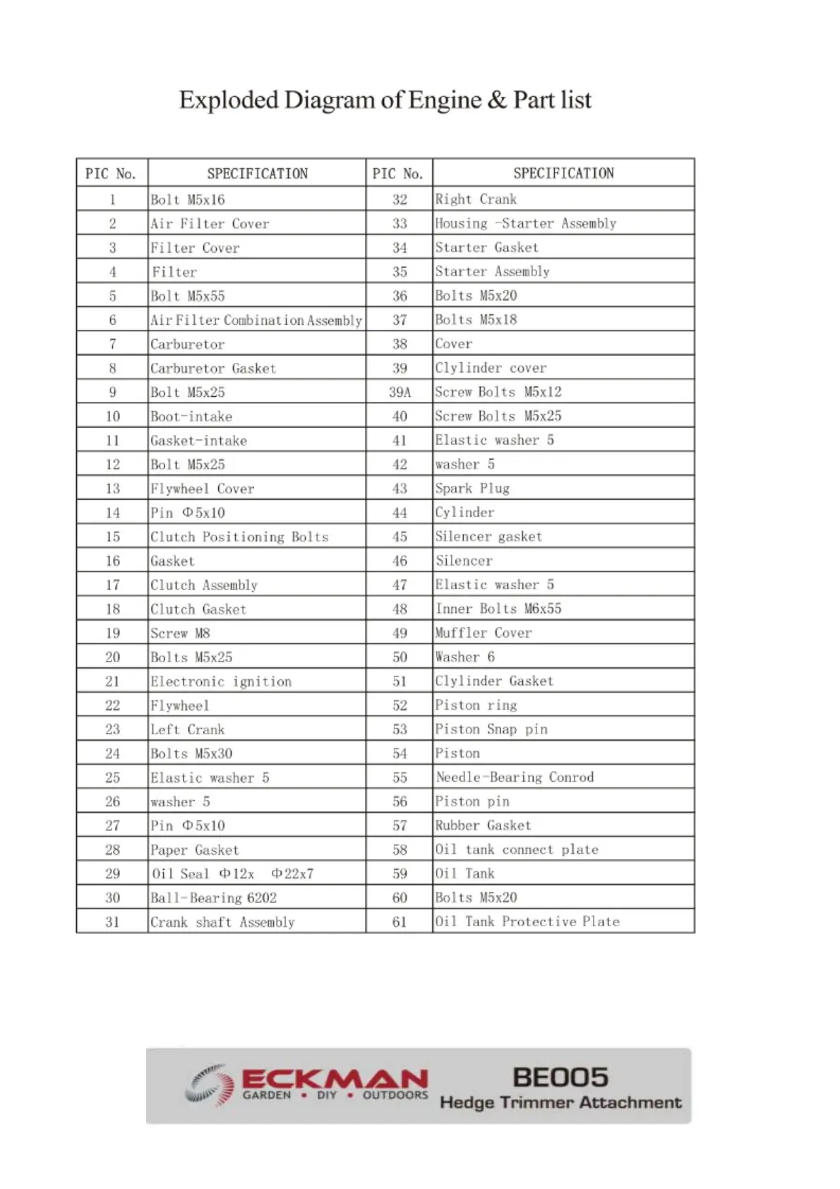 Eckman BE003 - Exploded Diagram and Part List