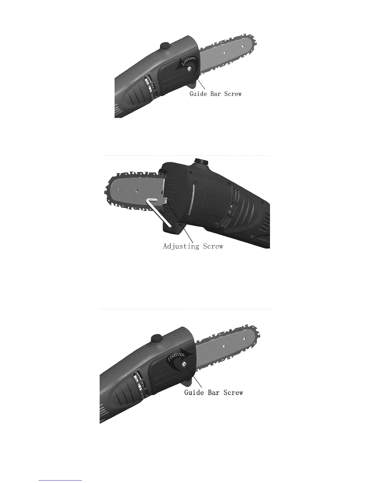 5. After chain tension is correct, tighten guide bar screw firmly.(See Figure 6)