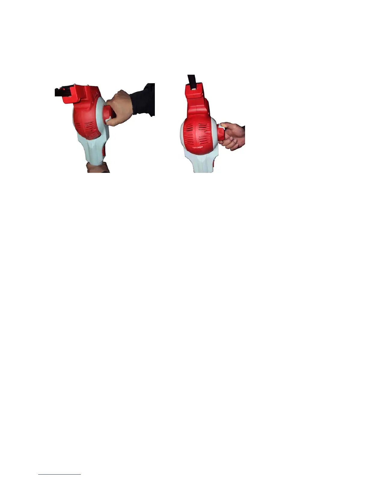 To change the angle of the trimmer head (from 0 – 90 degrees), grip the large red adjustment knob