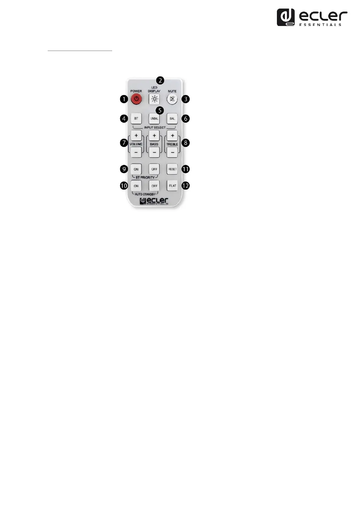 12. Flat: keep pressed (for 2 secs.) to reset the system to its default equalizer values: