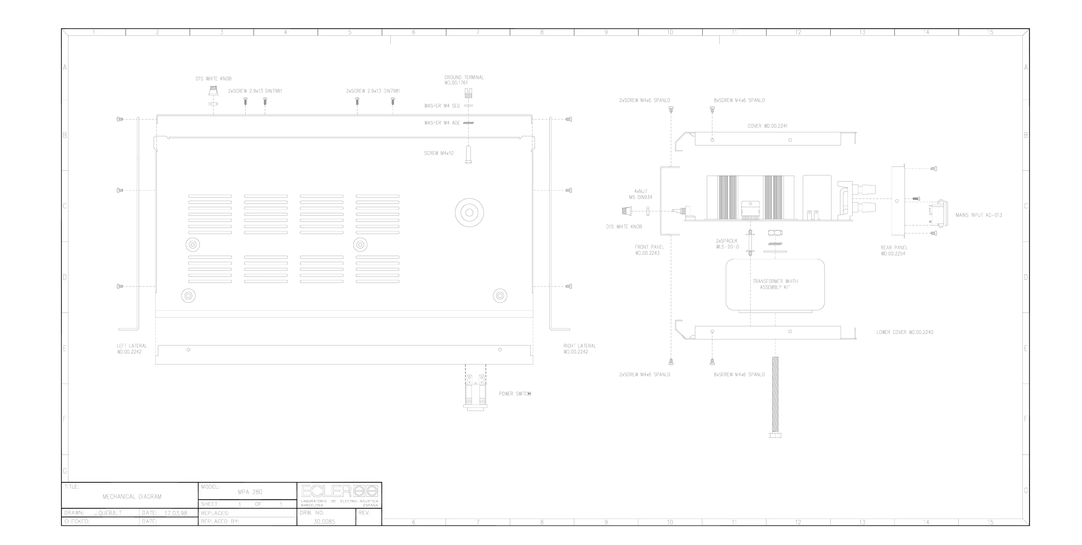 Ecler MPA280 - Mechanical Diagram; Front Panel and Control Components; Chassis, Side Panels, and Fixings; Rear Panel and Transformer Assembly