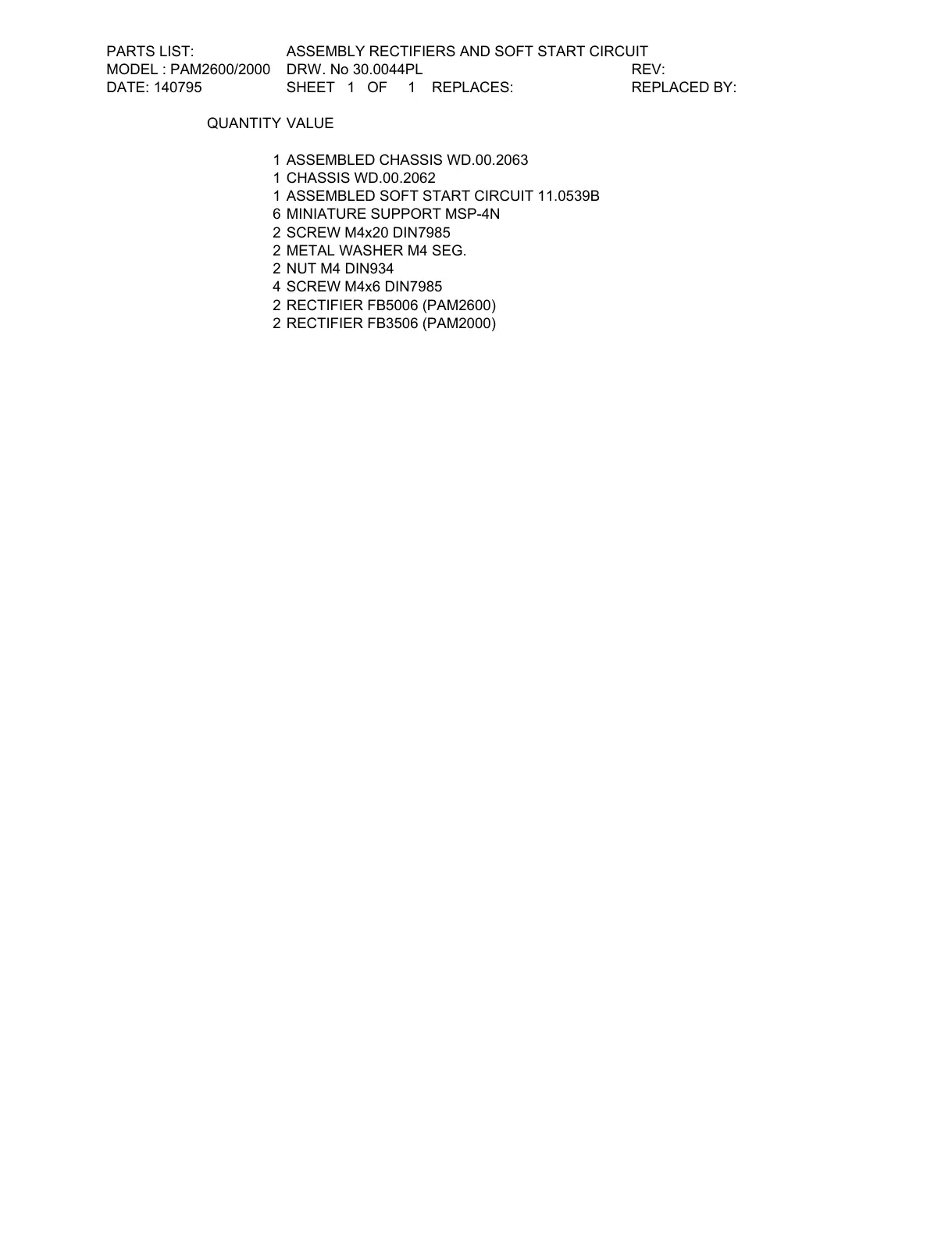 PARTS LIST: ASSEMBLY RECTIFIERS AND SOFT START CIRCUIT