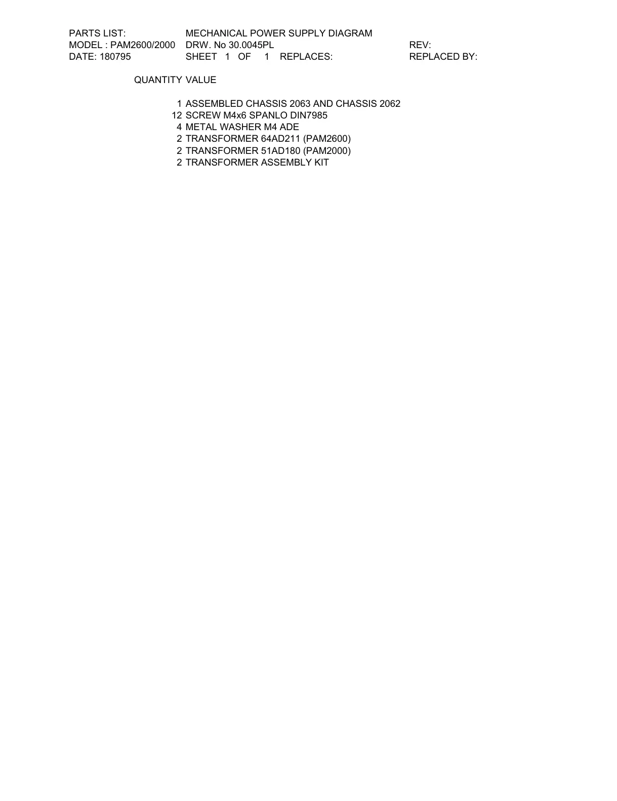MODEL : PAM2600/2000 DRW. No 30.0045PL REV: