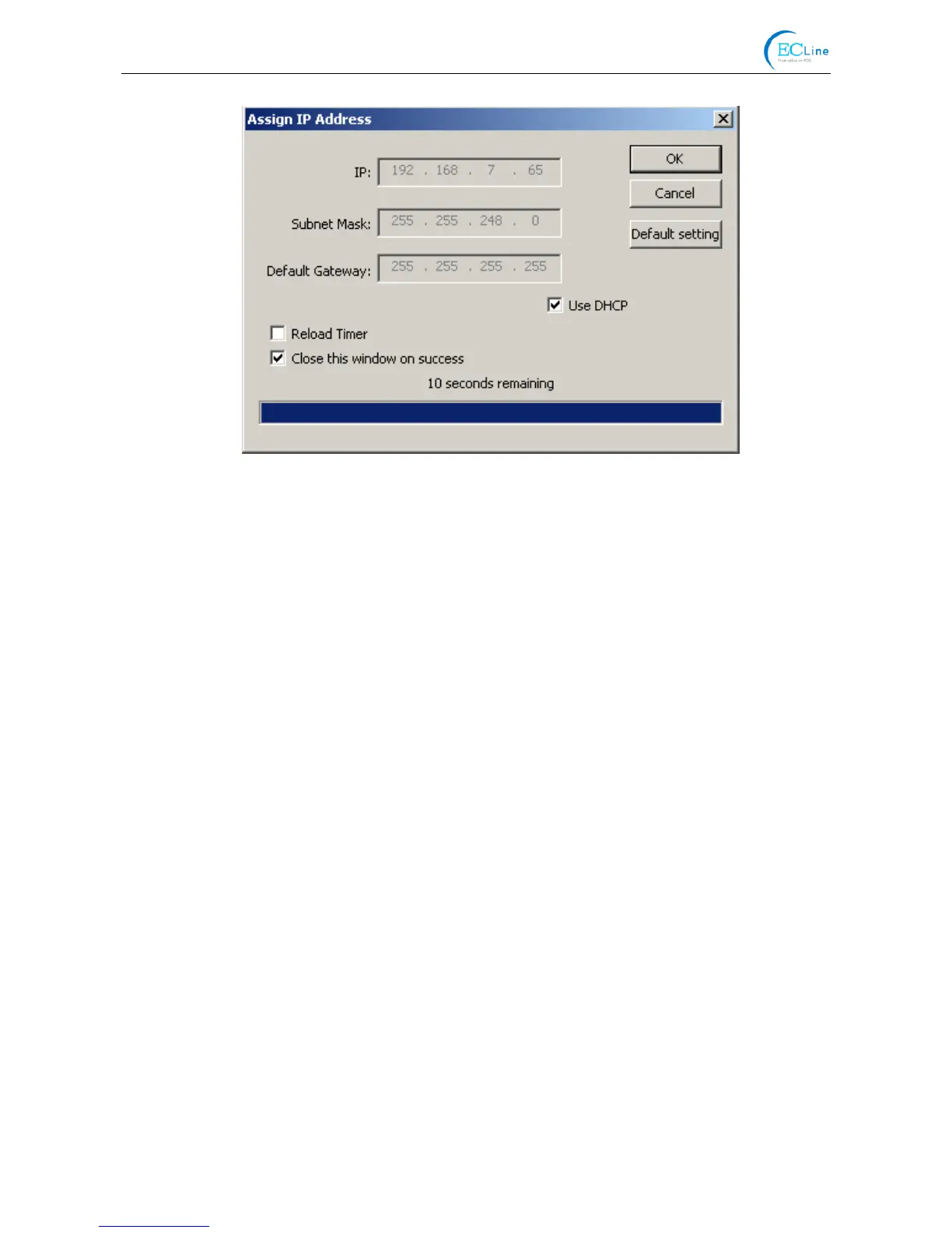 “Default Gateway”. If there is no gateway in the network, fill 255.255.255.255 in the “Default