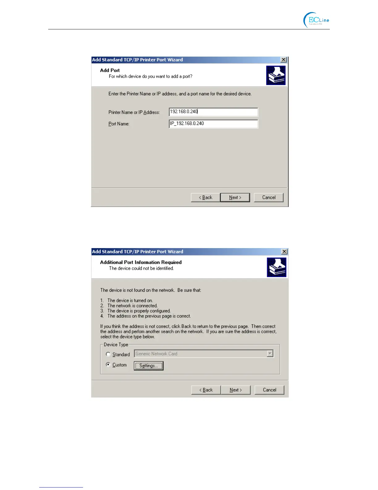 7) A window of “Additional Port Information Required” pops up, select “Custom” in the “Device Type”,