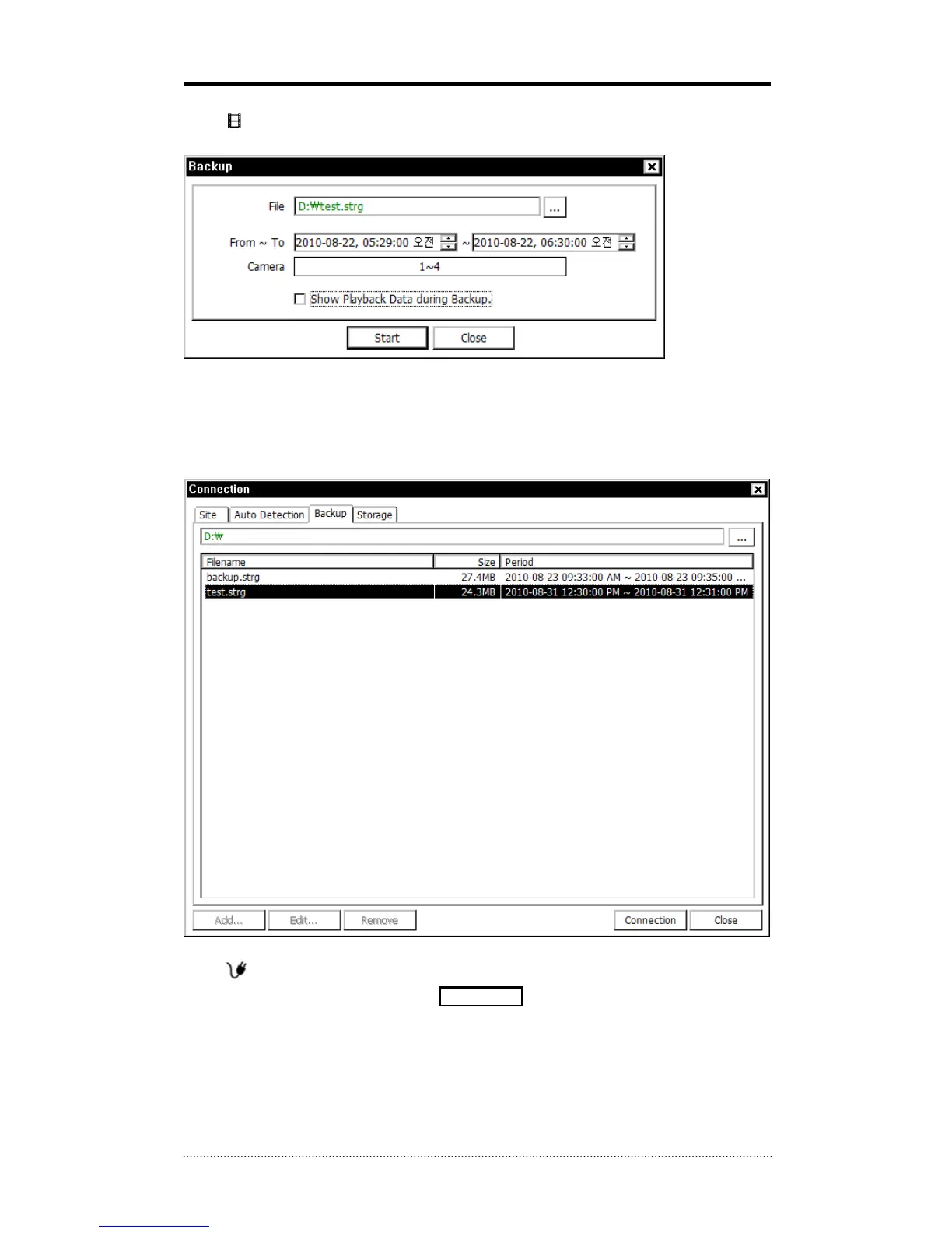 the data is saved. Select the file and click Connection to play the video.