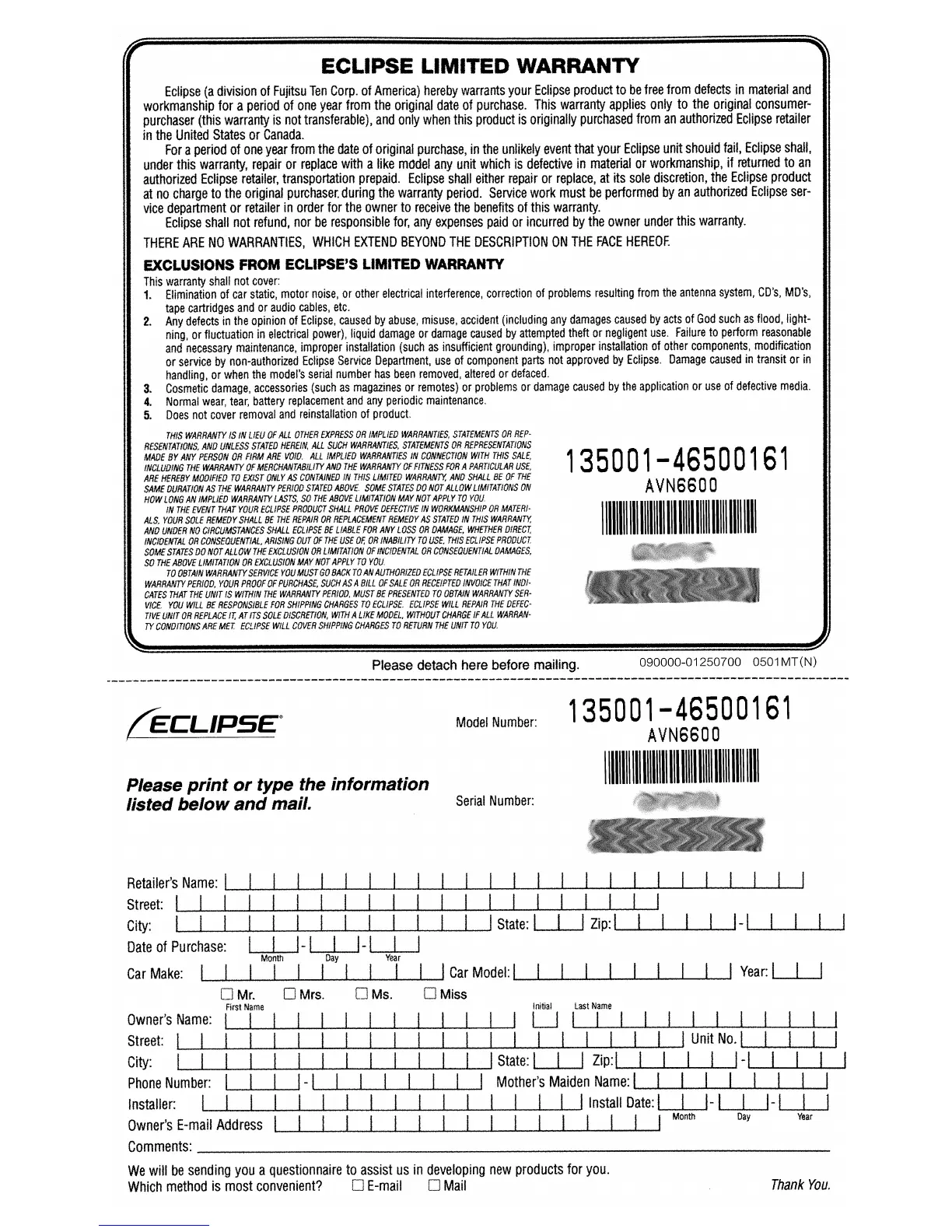 Eclipse AVN 6600 - Warranty and Registration Information