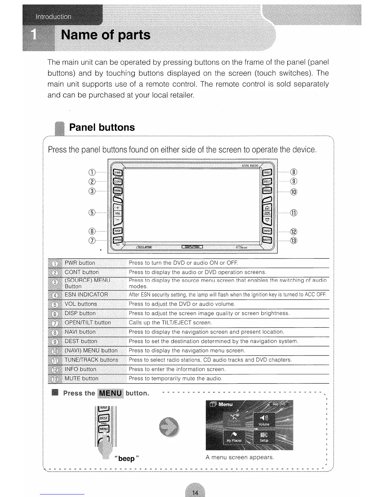 Eclipse AVN 6600 - AVN6600 Introduction and Basic Operations; Name of Parts and Controls