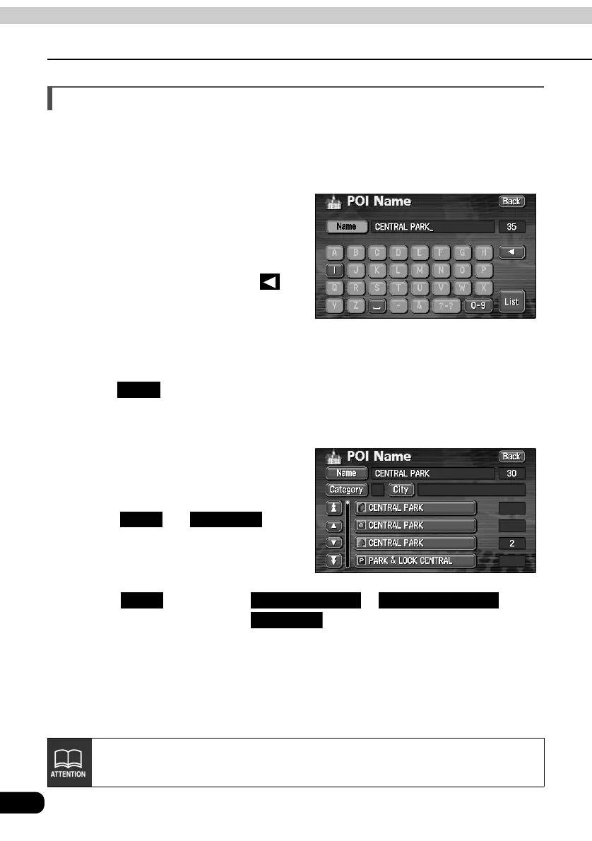 • A POI list screen containing names searched for from the entered characters is
