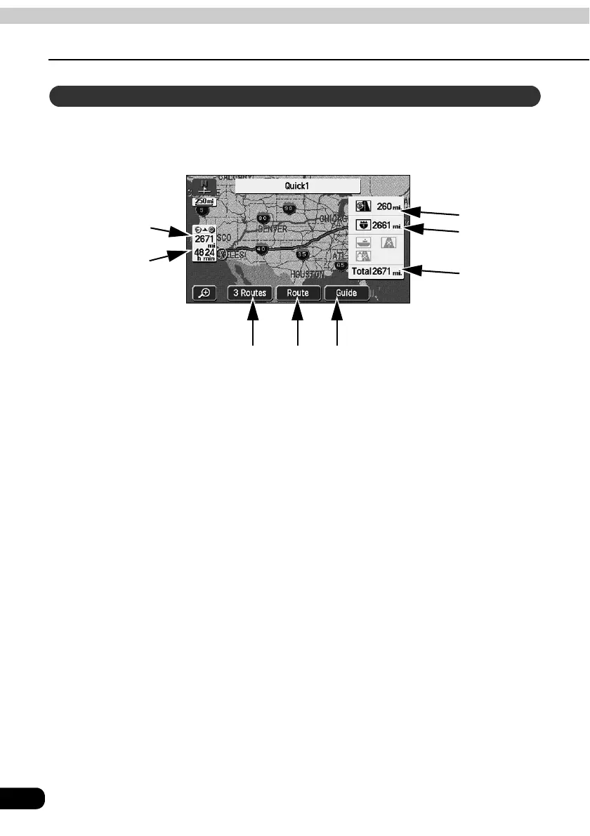 The distance to the destination for the route presently taken are displayed. (If deviating
