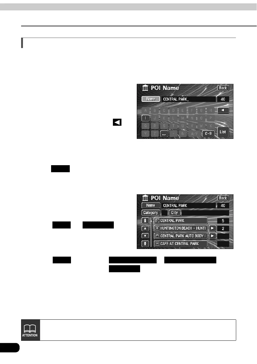 • A POI list screen containing names searched for from the entered characters is