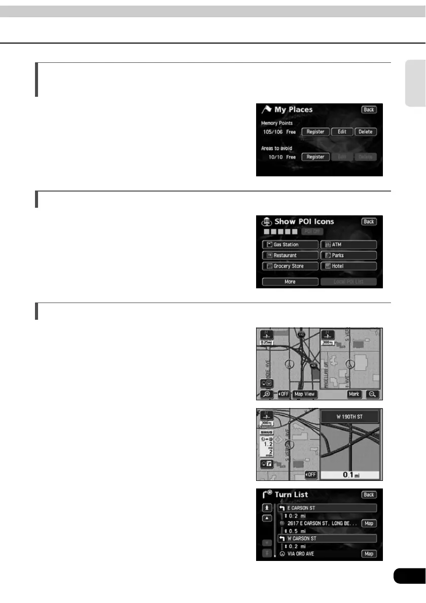 Diverse screen displays (Refer to pages 37, 38, 76)
