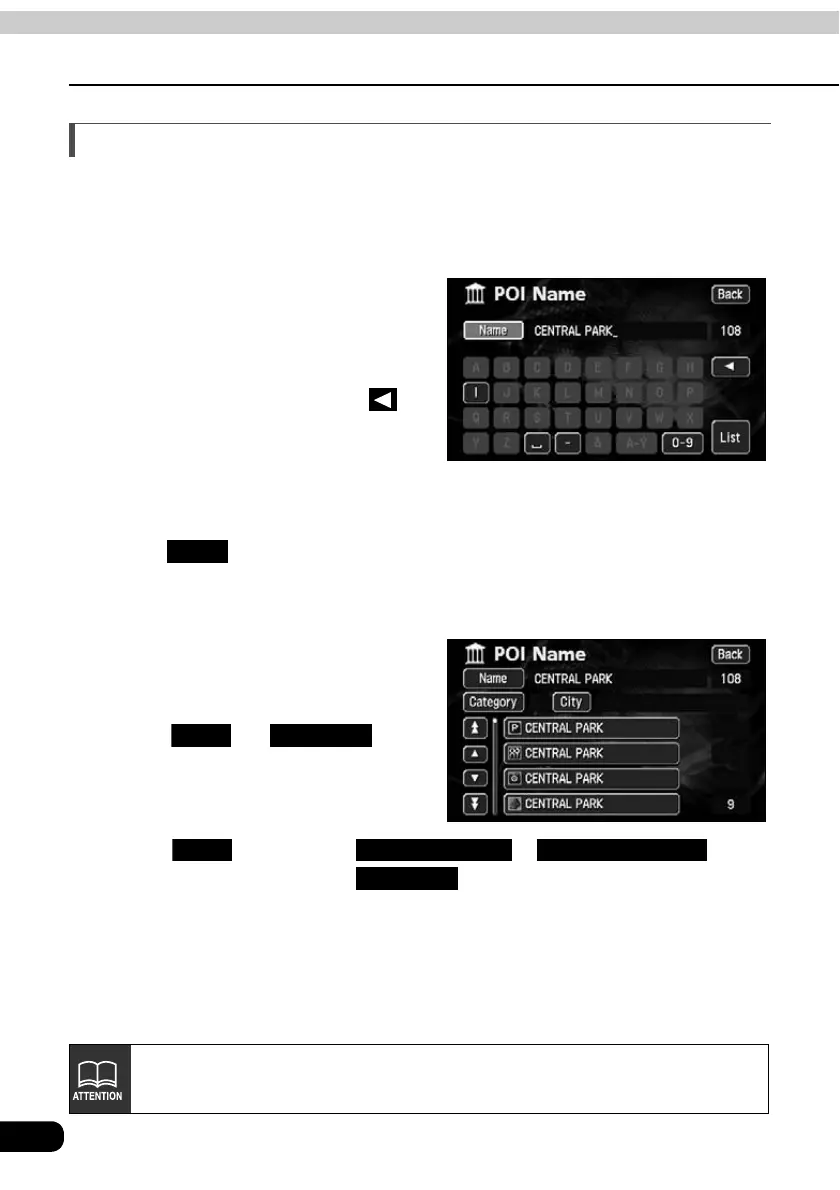 A map can be retrieved by entering a partial POI name or by narrowing down from a list of