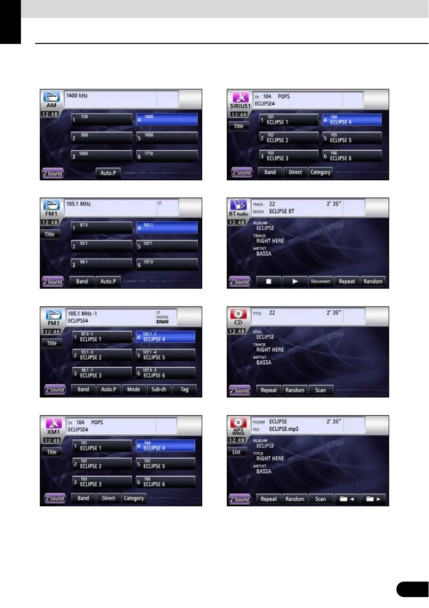 Eclipse AVN726E - Source Operations Screen; Radio (AM) screen; Radio (FM) screen; HD Radio screen (optional)