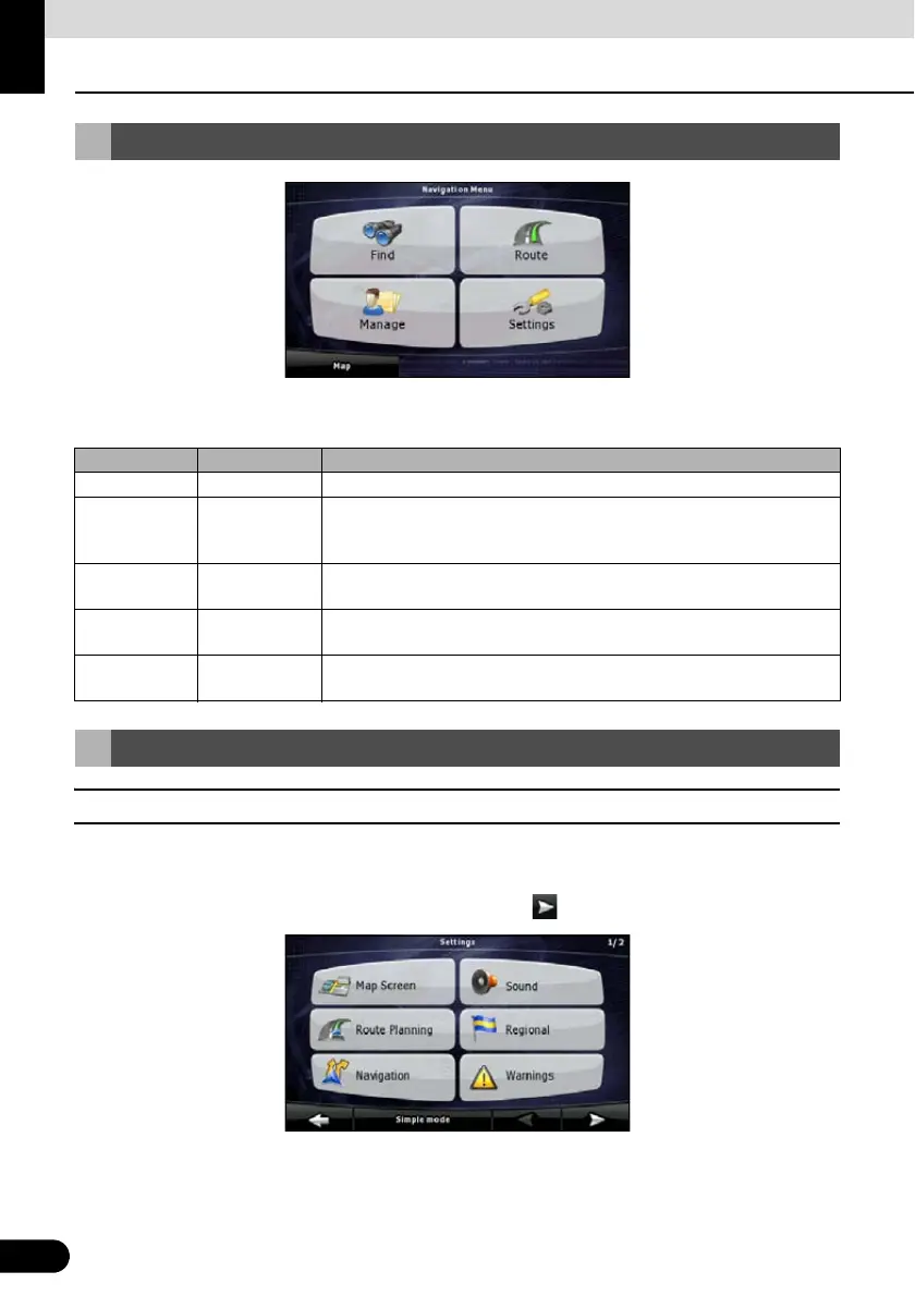This is the Navigation menu. From here, you can access the following screens. Touch the